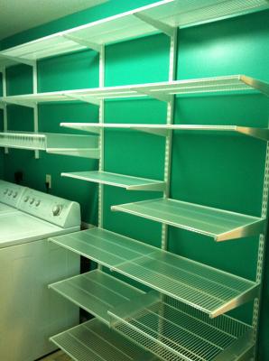 Creating a Shipshape Mail Room vertical wall space by installing Shelf Baskets and Ventilated Shelving for printer paper and other bulk supplies. A custom island was created in the center of the entire solution is elfa, the Shelves, Hanging Drawers, Shelf Baskets and utility ... Read Full Source